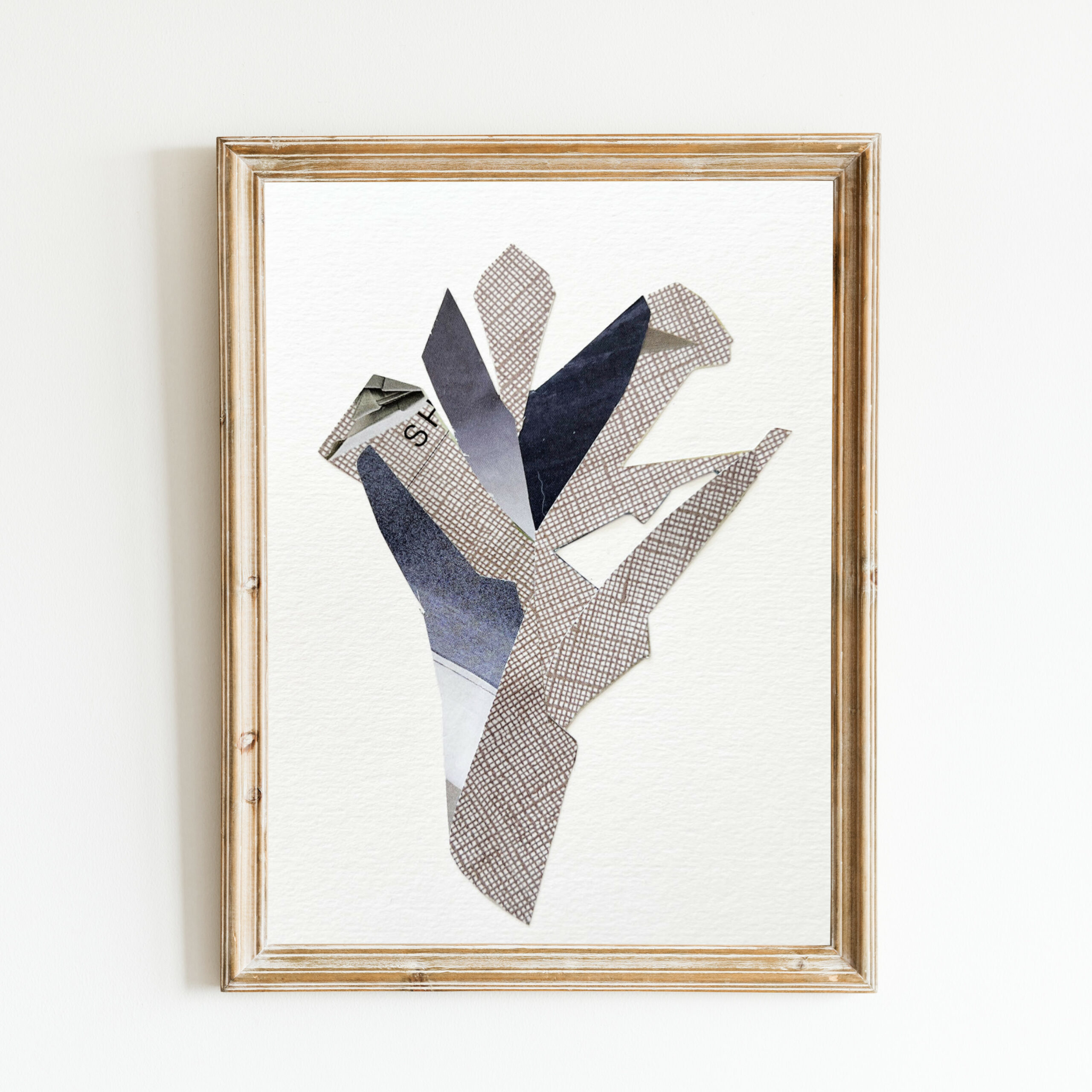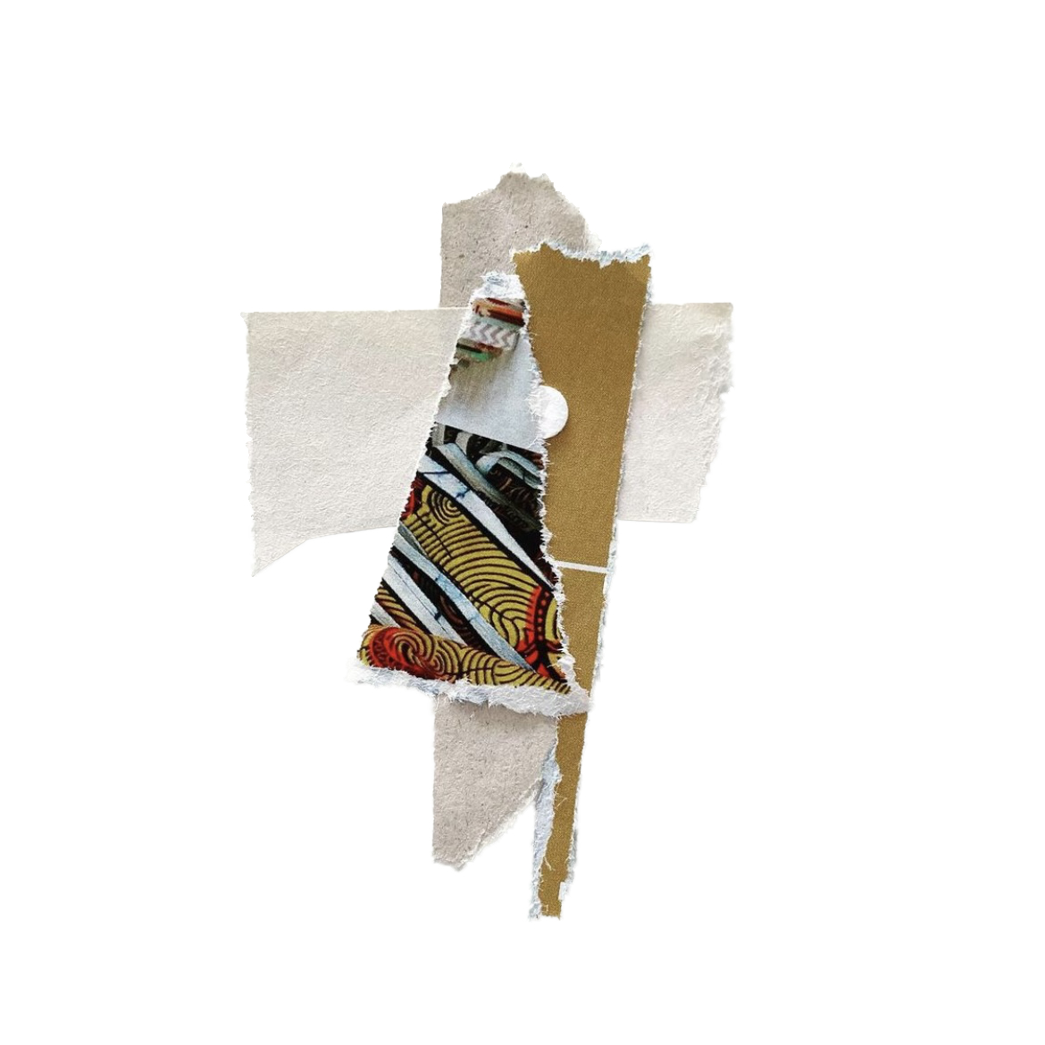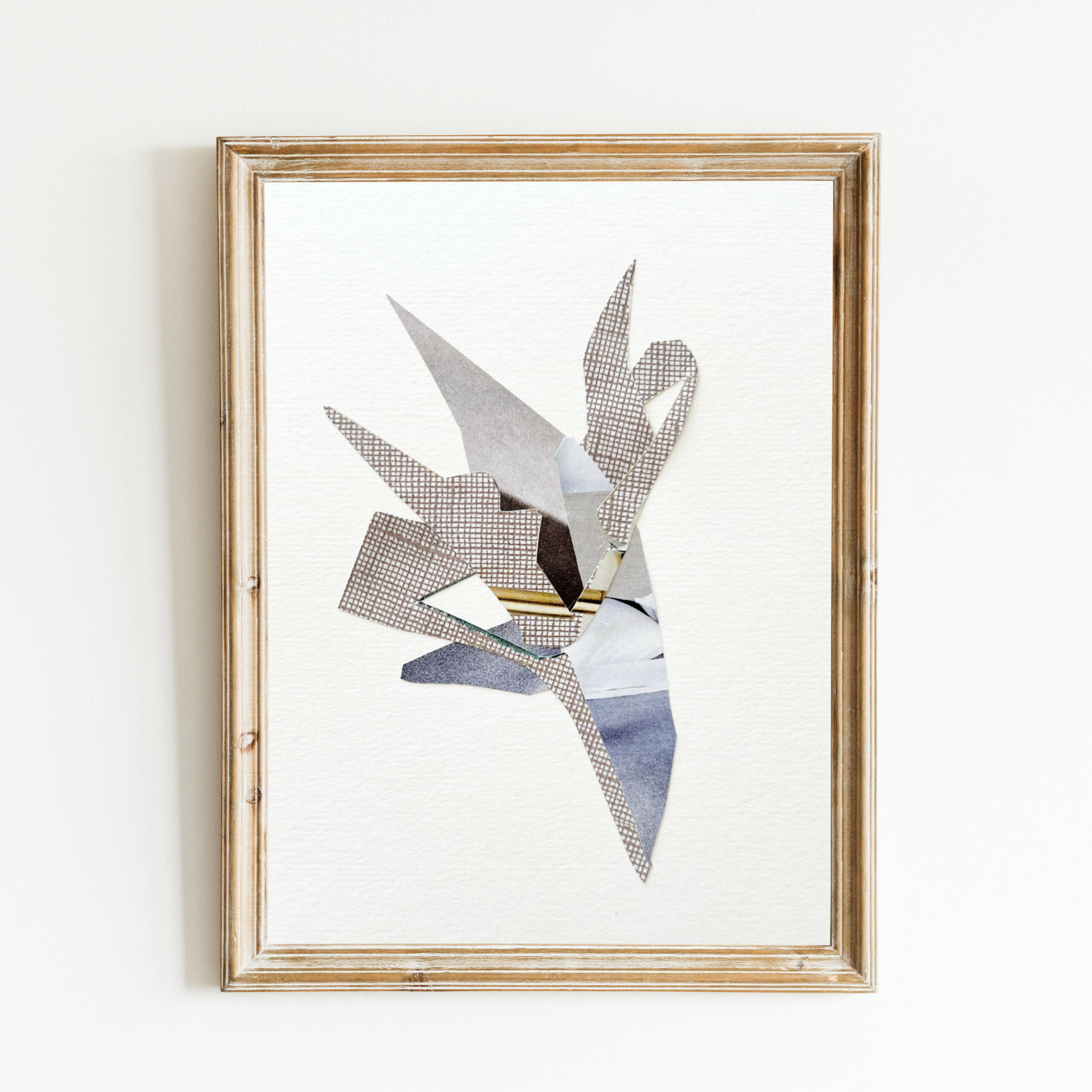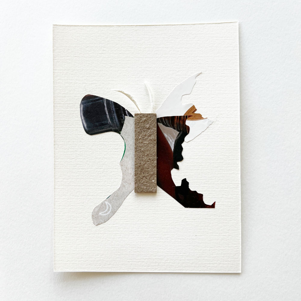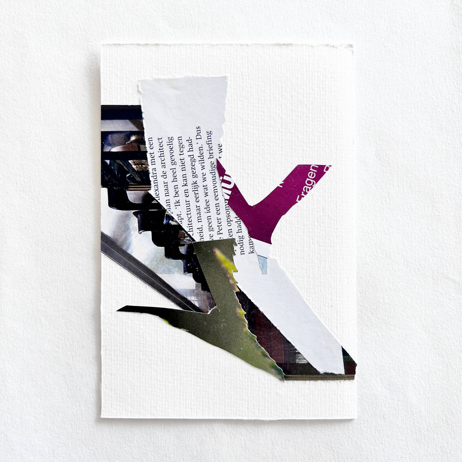 Er lag een chaos aan knipsels van de Vlinder collages op tafel. In al die willekeurige restjes zag ik drie beelden: een fakkel, een hand en een vogel die vanuit zijn plek op de tak uitkijkt. Het was de grootste uitdaging al die stukjes precies te plakken zoals ik ze zag. Een kleine pincet en een grote dosis perfectionisme later had ik met trots het eindresultaat: het Converted butterfly trio.