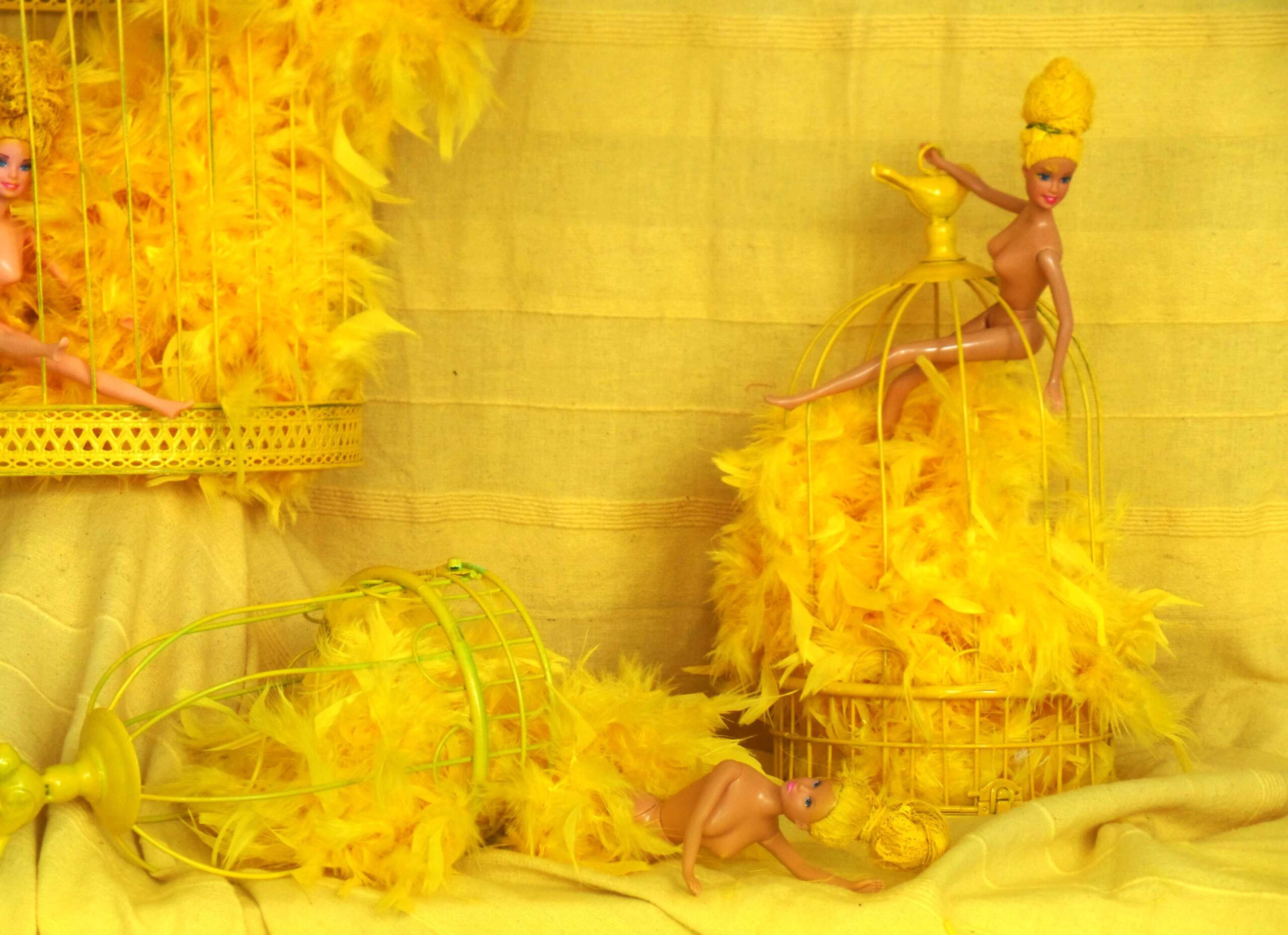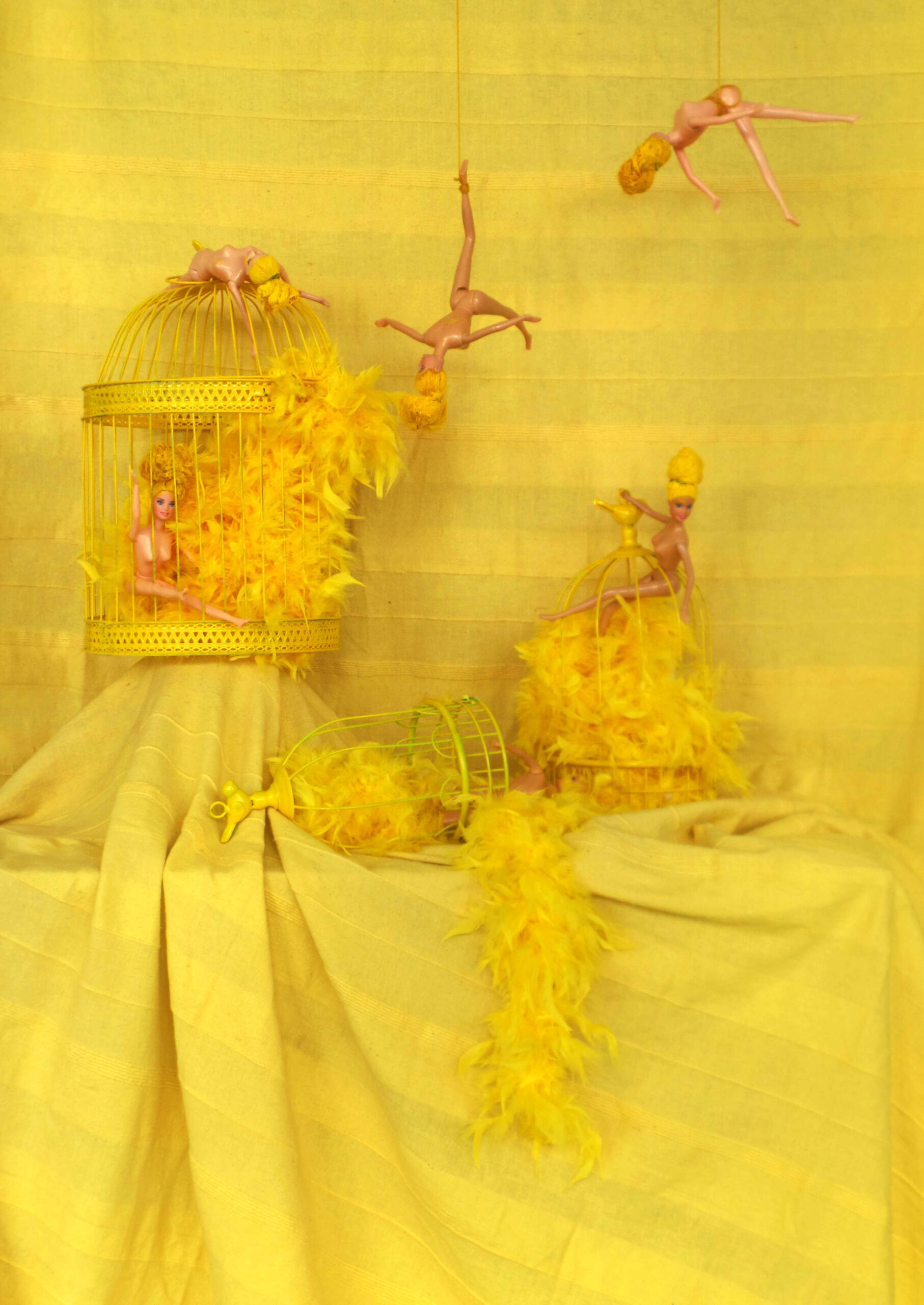 De opdracht was een tafeltje te stijlen in één van de vier tijdelijke trends van dat jaar. Ik koos voor Quirky. Quirky draaide om kunstzinnigheid, experimenteren, handwerk en hergebruik, digitaal drukken en lijnen en prints. Mijn eerste idee was het geheel in één kleur uit te werken. Alles geel. Dat vertaalde zich verder in een bizarre, lichtelijk seksueel getinte compositie waar geen kader omheen te leggen is.Ik werk steeds vaker met restpapier, oude verpakkingen en karton uit boekkaften. Voor onderstaande werkjes sneed ik een paar plakken karton uit een verpakkingsdoos.
